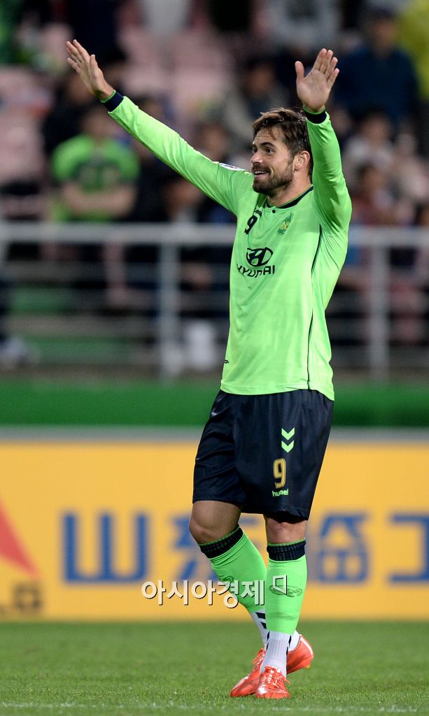 [전주=아시아경제 김현민 기자] 프로축구 전북 현대가 6일 전주월드컵경기장에서 산둥 루넝(중국)와 AFC 챔피언스리그 조별리그 최종전을 치렀다. 전북 에두가 후반 팀의 네 번째 골을 성공시키고 서포터즈를 향해 손을 흔들고 있다. 김현민 기자 kimhyun81@asiae.co.kr<ⓒ세계를 보는 창 경제를 보는 눈, 아시아경제(www.asiae.co.kr) 무단전재 배포금지>