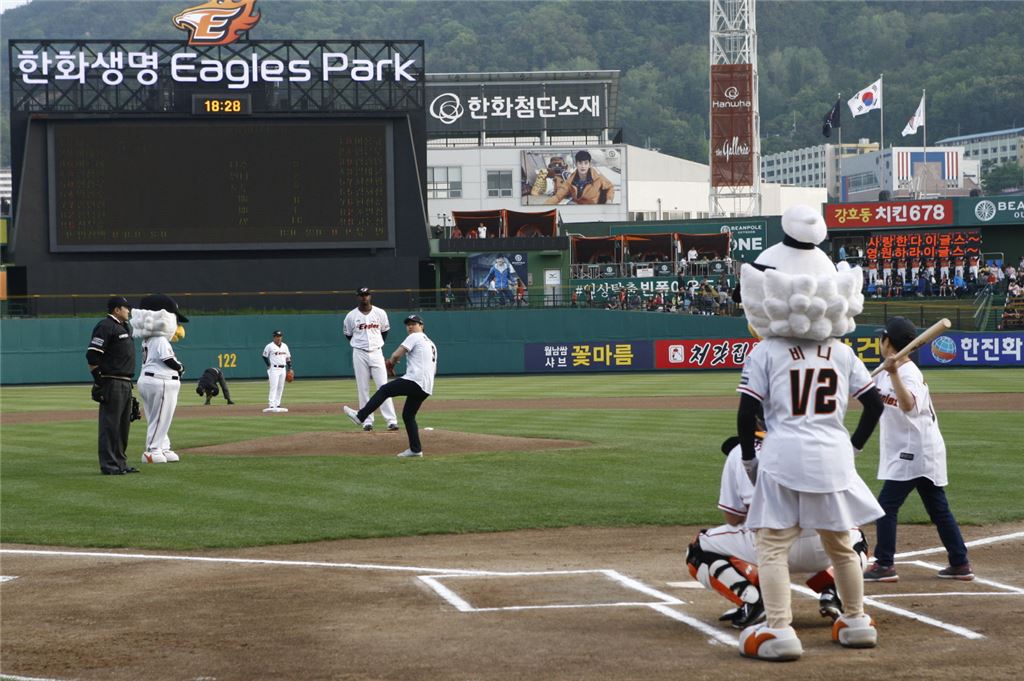 한화생명 이글스파크에서 열린 야구 경기에서 2011년 어머니를 위해 신장을 기증한 아들 최귀헌씨가 시구자로 참여해 시타자로 나선 어머니 박은희씨에게 공을 던지고 있다.