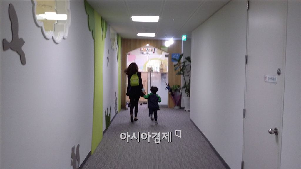 ▲여의도 LG트윈타워 내 직장 어린이집. 출근시간에 자녀를 맡기는 워킹맘이 아침 이른 시간 서둘러 어린이집으로 들어서고 있다.
