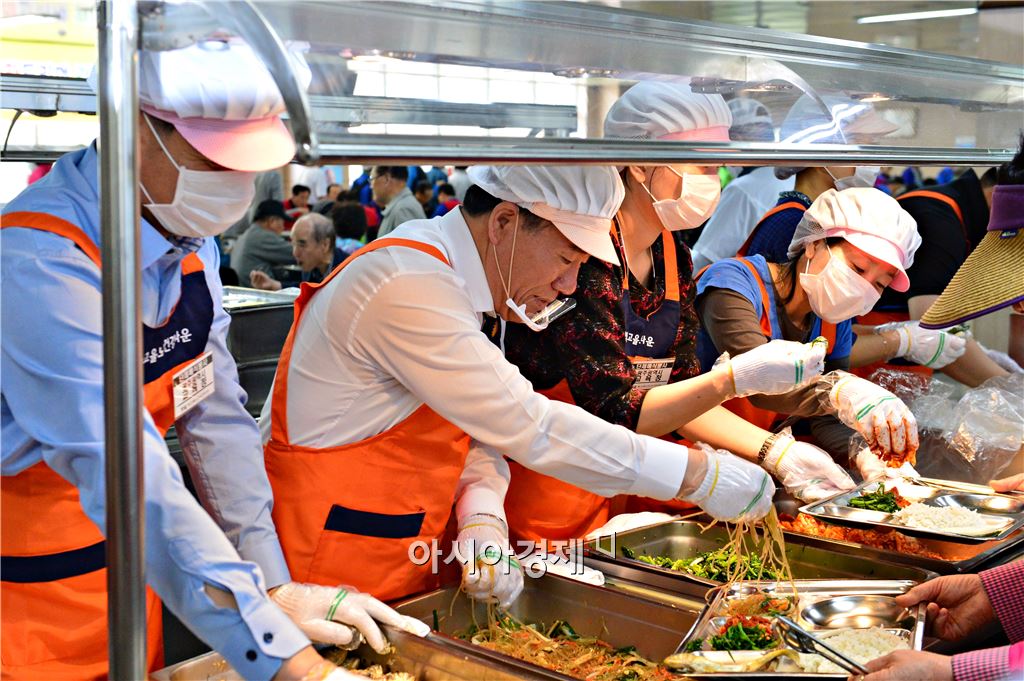 8일 장휘국 교육감을 비롯 교육청 직원들이 빛고을 노인건강타운으르 찾아 급식봉사를 실시했다. 사진제공=광주시교육청
