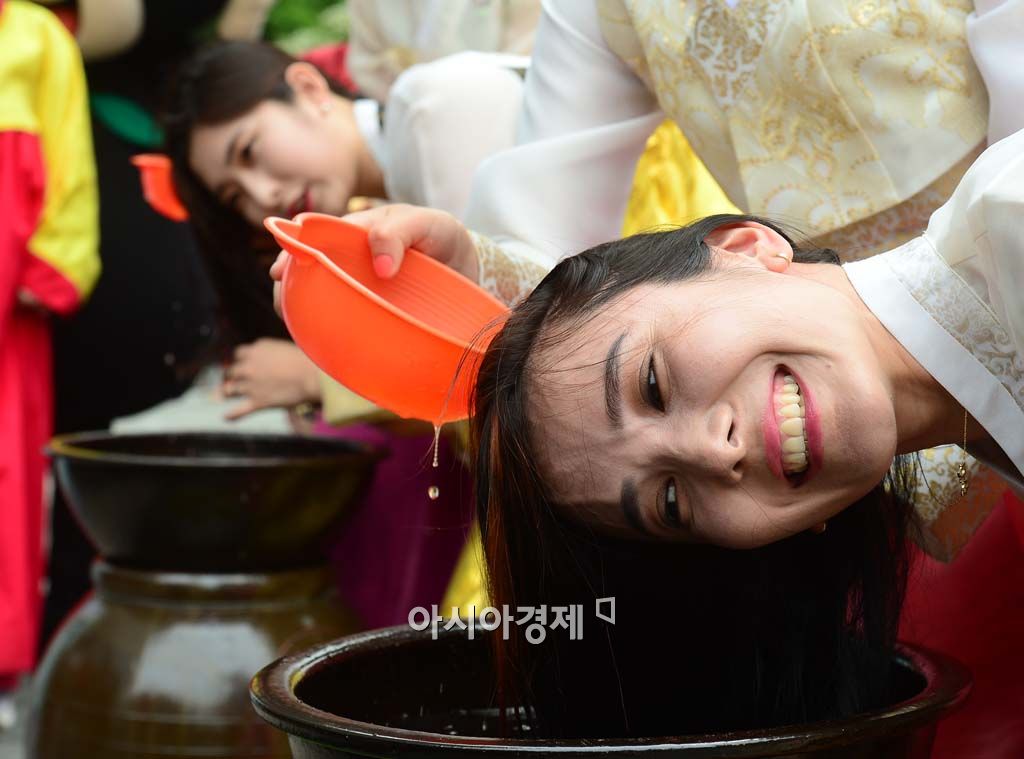 [아시아경제 백소아 기자] 11일 서울 청계광장에서 강릉단오제위원회 관계자들이 유네스코 인류무형문화유산 걸작 선정 10주년을 맞아 강릉단오제 홍보활동의 일환으로 청포물에 머리 감기 시연을 하고 있다.백소아 기자 sharp2046@asiae.co.kr<ⓒ세계를 보는 창 경제를 보는 눈, 아시아경제(www.asiae.co.kr) 무단전재 배포금지>