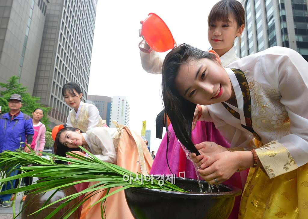 [아시아경제 백소아 기자] 11일 서울 청계광장에서 강릉단오제위원회 관계자들이 유네스코 인류무형문화유산 걸작 선정 10주년을 맞아 강릉단오제 홍보활동의 일환으로 청포물에 머리 감기 시연을 하고 있다.백소아 기자 sharp2046@asiae.co.kr<ⓒ세계를 보는 창 경제를 보는 눈, 아시아경제(www.asiae.co.kr) 무단전재 배포금지>