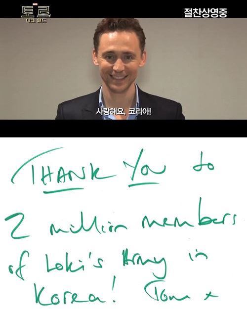 [아시아경제 온라인이슈팀] 할리우드 배우 톰 히들스턴이 과거 한국 영화팬들에게 감사 메시지를 전했던 사실이 알려지면서 화제가 되고 있다. 2013년 11월 소니 픽쳐스는 영화 '토르:다크 월드'가 200만 관객을 돌파한 것을 기념해 톰 히들스턴의 자필 편지와 영상을 공개했다. 톰 히들스턴은 로키를 상징하는 초록색 펜으로 적은 자필 편지를 통해 '한국에 계신 로키의 200만 팬들에게 정말 감사드립니다!(Thank you to 2 million members of Loki's Army in Korea!)'는 메시지를 전했다.또 편지와 함께 공개된 영상에서 톰 히들스턴은 손키스와 함께 한국어로 "사랑해요 코리아"라고 말했다. 2001년 드라마 '니콜라스 니클비의 인생과 모험'을 통해 데뷔한 톰 히들스턴은 이후 영화 '토르'와 '어벤져스' 등에 출연했다. 국내에서는 '히들이'라는 별칭을 얻을 정도로 많은 사랑을 받고 있다. 한편 11일 미국 매체 등을 통해 영화 '어벤져스' 시리즈 1,2에 각각 출연한 톰 히들스턴과 엘리자베스 올슨이 열애 중이라는 사실이 전해졌다. 두 사람은 아직 열애설에 대한 공식 입장을 밝히지는 않은 상황이다.온라인이슈팀 issue@asiae.co.kr<ⓒ세계를 보는 창 경제를 보는 눈, 아시아경제(www.asiae.co.kr) 무단전재 배포금지>