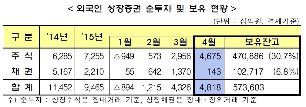 [아시아경제 임철영 기자]외국인이 올 들어 국내 상장주식을 7조원 넘게 사들인 것으로 나타났다. 지난 2월 이후 3개월 연속 순매수세를 지속하며 보유비중 역시 30%를 넘어섰다. 12일 금융감독원에 따르면 외국인은 지난 4월 국내 주식 4조6750억원어치를 순매수 한 것으로 집계됐다. 지난 2월 5730억원, 3월 2조9560억원 순매수에 이어 3개월째다. 이에 따라 올 들어 외국인의 국내 상장주식 총 순매수 규모는 7조2550억원을 기록했다. 외국인의 국내 상장주식 보유 잔고는 470조8860억원. 순매수 상위국가에 미국, 영국, 아일랜드가 올랐다. 지난달 미국 국적의 자금의 순매수 규모는 2조2653억원으로 3월 대비 1조원 이상 증가했다. 영국과 아일랜드 국적 자금의 순매수 규모 역시 각각 1조3053억원, 5313억원을 기록했다. 지난 3월 영국과 아일랜드 국적 자금의 순매수 규모는 4131억원, 350억원에 불과했으나 한 달 새 증가폭이 약 1조3000억원에 달했다.상장주식 보유 규모는 미국 180조5000억원, 영국 39조4000억원, 룩셈부르크 27조9000억원을 기록했다. 미국의 상장주식 보유 규모는 외국인 전체 보유액의 38%에 달했다. 순매도 상위국가에는 버뮤다, 독일, 스위스가 이름을 올렸다. 스위스 국적 자금은 지난 3월만해도 5000억원 가까운 순매수 규모를 기록했으나 한 달 만에 1557억원 순매도로 돌아섰다. 버뮤다와 독일 국적 자금은 각각 2722억원, 2358억원어치를 팔아치웠다.지역별로는 미국, 유럽, 아시아계 자금이 순매수 규모를 확대했다. 미국계 자금은 지난 3월 1조2651억원에서 2조2653억원으로 순매수 규모를 늘렸고, 유럽계 자금 역시 1조2633억원에서 1조4862억원으로 확대됐다. 아시아계 자금은 전월 대비 약 110억원 증가하는 데 그쳤다.외국인의 채권투자 규모는 3월 대비 감소했다. 외국인의 상장채권 순투자 규모는 1430억원으로 전월 1조3790억원 대비 10분의 1수준을 기록했다. 외국인의 상장채권 순매수 규모는 3조7000억원, 만기상환 규모는 3조5000억원으로 집계됐다. 국가별로는 싱가포르가 8985억원을 순투자했고 중국과 스위스가 각각 1316억원, 805억원으로 뒤를 이었다. 반면 말레이시아(8035억원), 프랑스(4115억원), 태국(1387억원)은 최대 순유출국 상위에 이름을 올렸다. 지역별로는 아시아와 중동계 자금이 3월에 이어 순투자를 지속했고 유럽계 자금은 3227억원 순유출로 전환했다.국가별 보유 규모는 미국이 18조8000억원으로 외국인 전체 보유액의 18%를 차지했다. 중국과 룩셈부르크의 보유 비중은 각각 16%, 11%를 기록했다.임철영 기자 cylim@asiae.co.kr<ⓒ세계를 보는 창 경제를 보는 눈, 아시아경제(www.asiae.co.kr) 무단전재 배포금지>