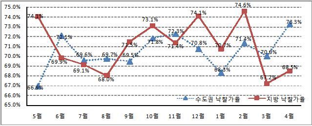 [아시아경제 주상돈 기자] 지난달 법원 부동산 경매 낙찰률이 40%에 육박한 것으로 나타났다. 진행건수는 줄어들고 낙찰건수는 늘어난 것으로 경매가 더 치열해진 셈이다.12일 지지옥션에 따르면 지난달 전국 경매 낙찰률은 39.4%를 기록하며 전달(37.8%)보다 1.6%포인트 늘었다. 이는 지난 2007년 2월(40%) 이후 8년2개월만의 최고치다. 경매진행건수는 전월대비 446건 감소한 1만4068건을, 낙찰건수는 49건이 증가한 5536건을 기록했다. 용도별로는 주거시설 2523건이 낙찰돼 전월 대비 190건 늘며 3개월 연속 상승했다. 업무·상업시설 및 토지는 소폭 하락하며 각각 843건, 2010건이 낙찰됐다. 주거시설에 대한 관심이 이어지면서 전체 낙찰건수가 늘은 것이다.평균 낙찰가율은 71.3%로 지난달 68.8%에 비해 2.5%포인트 상승하며 한 달 만에 70%대 낙찰가율을 회복했다. 총 낙찰가는 1조3877억원으로 전월 대비 363억원이 줄었으나 지난달에 이어 올해 두 번째로 많은 수준이다. 수도권 낙찰가율은 73.3%로 전월보다 3.3%포인트 상승했다. 부산과 대구, 광주, 대전, 울산 등 지방 5대 광역시 낙찰가율은 85.8%를 기록하며 전달에 비해 3.2%포인트 상승했다. 강원과 충북, 충남, 경북, 경남, 전북, 전남, 세종, 제주 등 지방도는 0.9%포인트 하락한 63.4%를 기록했다. 이는 지난 2013년 11월(61.1%) 이후 1년5개월 만의 최저치다.총 낙찰액을 낙찰건수로 나눈 경매 1건당 평균 낙찰가는 2억5068만원으로 전월에 비해 1117만원 줄었다. 평균응찰자는 4.4명을 기록해 지난달에 비해 0.1명 줄어들었으나 여전히 2006년 이후 가장 높은 경쟁률을 보이고 있다. 이창동 지지옥션 선임연구원은 "4월 법원경매는 각종 경매지수가 전월과 비슷한 지표를 나타내며 고경쟁·고낙찰 현상이 이어지고 있는 것으로 보인다"며 "수도권을 중심으로 주거시장에 대한 관심이 계속 이어지고 있고, 상가와 토지 등 경쟁력 있는 수익성 물건에 대한 경쟁도 더 치열해졌다"고 말했다.한편 최다 응찰자가 몰린 물건은 전남 구례군 간전면 운천리 인근 6,744㎡ 규모의 임야였다. 79명이 경쟁해 감정가의 859.2%인 8112만원에 낙찰됐다. 최고낙찰가는 인천에서 나왔다. 부평구 청천동 한국수출산업 제4차 국가산업단지에 위치한 공장이 감정가의 70% 수준인 223억원에 새 주인을 찾았다. 주상돈 기자 don@asiae.co.kr<ⓒ세계를 보는 창 경제를 보는 눈, 아시아경제(www.asiae.co.kr) 무단전재 배포금지>