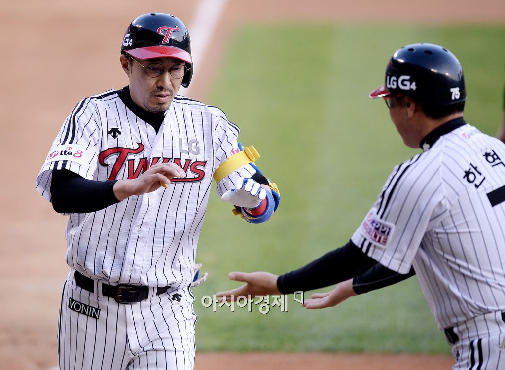 [잠실=아시아경제 김현민 기자] 2015 KBO리그 NC 다이노스와 LG 트윈스의 경기가 13일 잠실야구장에서 열렸다. 1회말 LG 선두타자 정성훈이 NC 선발 찰리를 상대로 좌월 동점 솔로 홈런을 치고 한혁수 코치와 하이파이브하고 있다. 김현민 기자 kimhyun81@asiae.co.kr<ⓒ세계를 보는 창 경제를 보는 눈, 아시아경제(www.asiae.co.kr) 무단전재 배포금지>