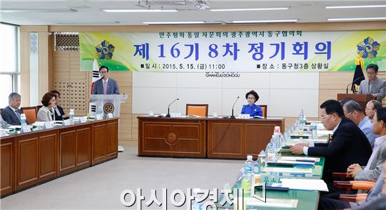민주평화통일자문회의 동구협의회는 15일 동구청 3층 상황실에서 임영일 동구청장 권한대행, 김행자 동구협의회장, 민주평통 자문위원 등이 참석한 가운데 2015년 2분기 정기회의를 개최하고 영상물 상영, 통일의견수렴 주제보고회를 가졌다. 사진제공=광주시 동구