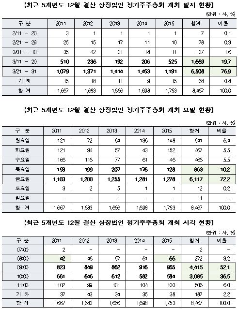 개최요일 금요일 비중 72%에 달해…개최시각 절반 이상은 오전 9시개최일은 3월21~31일에 77% 몰려…지역은 수도권[아시아경제 박미주 기자]상장사들의 정기주주총회 쏠림현상이 여전한 것으로 나타났다. 3월 마지막주, 금요일에 집중된 것으로 조사됐다.17일 한국예탁결제원에 따르면 최근 5개년도 12월 결산 상장법인의 정기주주총회 개최일은 3월21~31일이 6508회(76.9%)로 가장 많았다. 다음으로 3월11~20일이 1669회(19.7%)로 많았다. 3월21~31일 유가증권시장은 2284회(64.7%), 코스닥시장은 4224회(85.5%) 개최했다.정기주총 개최 요일은 금요일이 6117회(72.2%)로 압도적으로 많았다. 두 번째는 목요일(863회, 10.2%)이었다. 유가증권시장의 경우 금요일(2884회, 81.7%) 집중도가 매우 높았다. 코스닥시장은 금요일(3233회, 65.5%), 목요일(608회, 12.3%)로 비교적 분산됐다.정기주총 개최 시각 또한 오전 9시(4415회, 52.1%)로 절반 이상 집중됐다. 이 시각 개최횟수는 계속 증가하고 있다. 2011년 오전 9시 정기주총 개최는 823회였으나 올해에는 965회로 17.3% 증가했다. 반면 같은 오전 10시 개최는 661회에서 584회로 77회(11.6%) 감소했다. 다른 개최시각은 큰 변화가 없었으나 오전 8시 개최는 42회에서 66회로 24회(57.1%) 늘었다.시장별로 유가증권시장은 오전 9시 개최(1580회, 44.8%)와 오전 10시 개최(1497회, 42.4%)간 차이가 크지 않았지만, 코스닥시장 상장법인은 오전 9시 개최(2835회, 57.4%)와 오전 10시 개최(1588회, 32.2%)간 차이가 비교적 큰 것으로 나타났다.개최지 지역별로는 수도권으로 여전히 쏠렸다. 최근 5개년간 정기주총 개최는 서울(3529회, 41.7%)과 경기(2252회, 26.6%)에 집중됐다. 다만 5년간 서울은 746회에서 707회로 39회(5.2%) 인천은 72회에서 70회로 2회(2.8%) 각각 감소했다. 같은 기간 광주(100.0%), 대전(41.7%), 전북(30.8%), 강원(30.0%)지역은 개최가 증가했다.