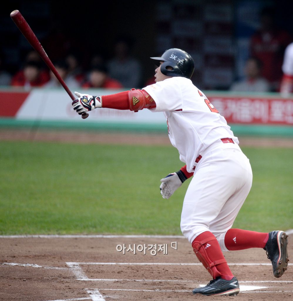 [문학=아시아경제 김현민 기자] 2015 타이어뱅크 KBO리그 한화 이글스와 SK 와이번스의 경기가 19일 문학야구장에서 열렸다. 1회말 무사 2,3루에서 SK 이재원이 선취 2타점 적시타를 치고 있다. 김현민 기자 kimhyun81@asiae.co.kr<ⓒ세계를 보는 창 경제를 보는 눈, 아시아경제(www.asiae.co.kr) 무단전재 배포금지>