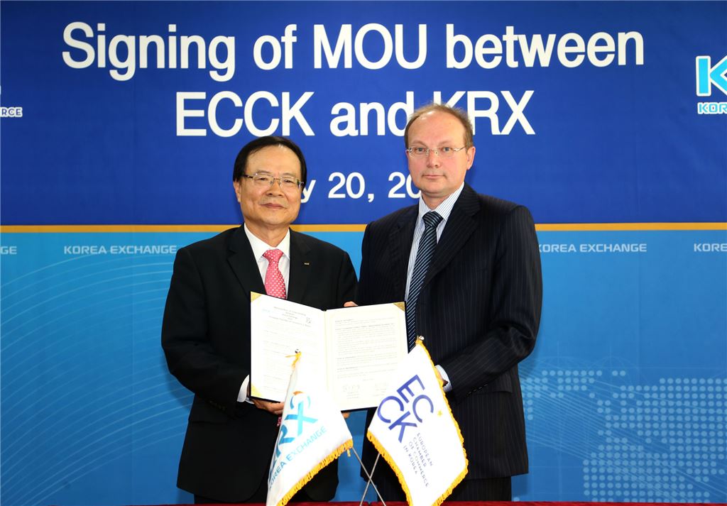 업무협약서 서명 후 기념촬영 왼쪽부터 최경수 한국거래소 이사장, 크리스토퍼 다베스 주한 유럽상공회의소 회장<br />