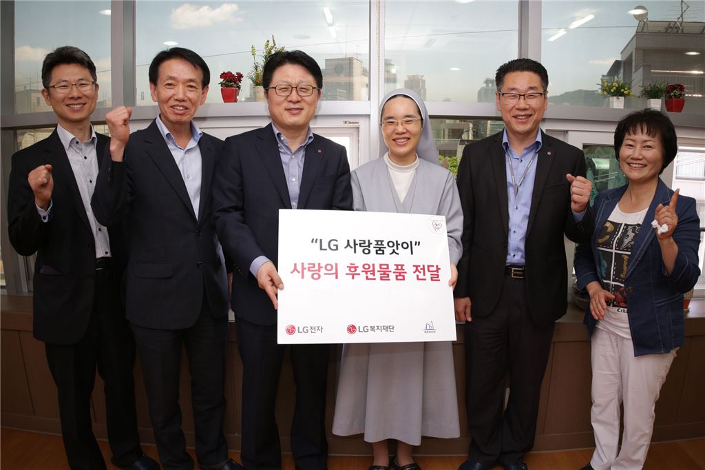 LG전자 최고기술책임자(CTO) 안승권 사장(왼쪽에서 세번째)을 비롯해 노동조합, 라이프스굿(Life's Good) 임직원 자원봉사단 등 LG전자 임직원 약 50명이 21일 서울 서초동 '성심노인센터'와 경기도 평택시 노인복지시설 '나누미 요양원'을 방문해 'LG사랑품앗이' 캠페인을 전개한 후 기념촬영을 하고 있다.
