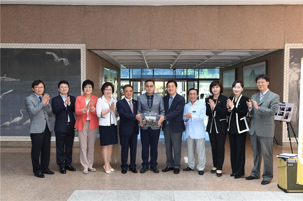 수원시 헌 안경 기부문화 행사에 동참한 인사들이 기념촬영을 하고 있다.