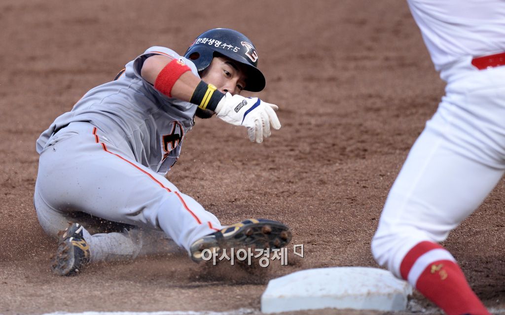 [인천=아시아경제 김현민 기자] 2015 KBO리그 한화 이글스와 SK 와이번스의 경기가 21일 문학야구장에서 열렸다. 2회초 무사 1루에서 한화 권용관 타석 때 1루주자 이용규가 상대 견제 실책을 틈타 3루까지 진루하고 있다. 김현민 기자 kimhyun81@asiae.co.kr<ⓒ세계를 보는 창 경제를 보는 눈, 아시아경제(www.asiae.co.kr) 무단전재 배포금지>