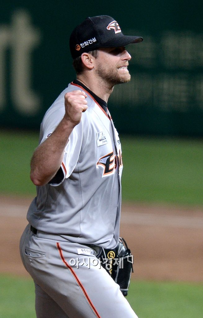[인천=아시아경제 김현민 기자] 2015 KBO리그 한화 이글스와 SK 와이번스의 경기가 21일 문학야구장에서 열렸다. 한화 선발투수 탈보트가 5회말 2,3루의 위기에서 SK 박재상을 삼진으로 처리한 뒤 환호하고 있다. 김현민 기자 kimhyun81@asiae.co.kr<ⓒ세계를 보는 창 경제를 보는 눈, 아시아경제(www.asiae.co.kr) 무단전재 배포금지>