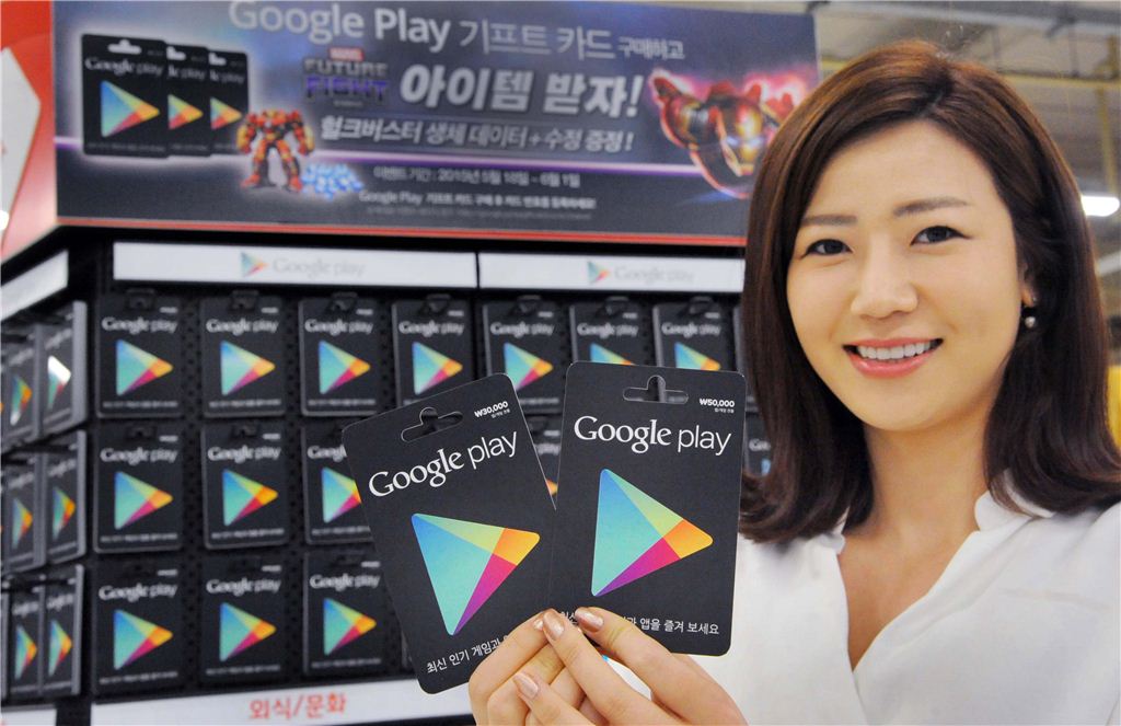22일 홈플러스 금천점에서 모델이 구글 플레이 기프트 카드 이벤트를 알리고 있다. 홈플러스는 6월1일까지 전국 124개 매장에서 구글 플레이 기프트 카드를 구매 하면 마블 퓨처파이트 게임 아이템을 증정하는 행사를 진행한다.<br />