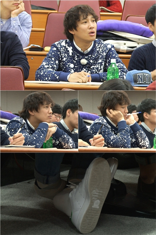 [아시아경제 온라인이슈팀] 서울대학교 학생으로 변신한 '1박2일' 차태현의 청강 현장 사진이 공개돼 화제다. 24일 저녁 방송될 KBS2 '해피선데이-1박 2일 시즌3'(이하 '1박2일')에서는 서울대학교에서 배움을 체험하는 '서울대 가다' 두 번째 이야기가 그려진다. 이에 앞서 '1박2일' 제작진이 공식 페이스북을 통해 청강 중인 차태현의 스틸을 공개해 이목을 집중시켰다. 공개된 스틸 속에는 차태현이 강의실에서 학생들과 함께 수업을 듣고 있는 모습이 담겨있다. 차태현은 두 눈을 빛내며 열정적으로 수업에 참여하고 있다. 그런 그의 모습이 영락없는 대학생 같아 보여 눈길을 끈다. 앞서 진행된 녹화에서 멤버들은 보다 완벽한 서울대 학생으로 거듭나기 위해 실제 서울대의 수업을 들어보는 시간을 가지게 됐다. 차태현은 깃발레이스를 통해 결정된 강의를 듣기 위해 강의실로 발걸음을 옮겼다. 이후 차태현은 범상치 않은 모범생 포스를 뽐내 주위의 놀라움을 샀다. 그는 물병에 턱을 괴고 칠판을 뚫어져라 쳐다보는가 하면 볼펜을 입에 물고 수업 내용을 찬찬히 생각하는 등 강의에 집중해 모두를 놀라게 만들었다는 후문이다. 하지만 스틸 속에는 차태현의 '반전자태'까지 담겨 있어 웃음을 자아낸다. 집중하는 듯 했던 차태현의 헐벗은 발의 자태가 공개된 것이다. 특히 수업이 끝난 뒤 그는 "난 모르겠어" "이 수업 어떻게 듣니?"라고 한탄을 해 웃음을 자아냈다.온라인이슈팀 issue@asiae.co.kr<ⓒ세계를 보는 창 경제를 보는 눈, 아시아경제(www.asiae.co.kr) 무단전재 배포금지>
