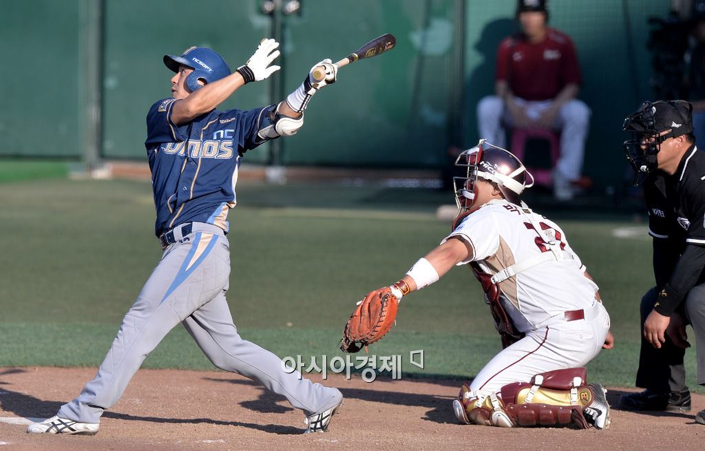[목동=아시아경제 김현민 기자] 2015 KBO리그 NC 다이노스와 넥센 히어로즈의 경기가 24일 목동야구장에서 열렸다. 9회초 1사 1,3루에서 NC 손시헌이 동점 1타점 적시타를 치고 있다. 김현민 기자 kimhyun81@asiae.co.kr<ⓒ세계를 보는 창 경제를 보는 눈, 아시아경제(www.asiae.co.kr) 무단전재 배포금지>