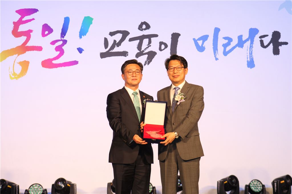 [아시아경제 정현진 기자] 한헌수 숭실대 총장(오른쪽)은 홍용표 통일부 장관으로부터 대학사회 내 통일 확산에 기여한 공로로 26일 오후 광화문 나인트리컨벤션에서 감사패를 받았다. 정현진 기자 jhj48@asiae.co.kr<ⓒ세계를 보는 창 경제를 보는 눈, 아시아경제(www.asiae.co.kr) 무단전재 배포금지>