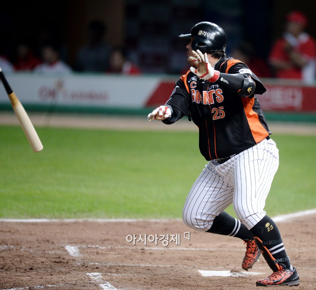 [인천=아시아경제 김현민 기자] 2015 KBO리그 롯데 자이언츠와 SK 와이번스의 경기가 26일 문학야구장에서 열렸다. 7회초 무사 1루에서 롯데 최준석이 SK 전유수를 상대로 추가 투런 홈런을 치고 있다. 김현민 기자 kimhyun81@asiae.co.kr<ⓒ세계를 보는 창 경제를 보는 눈, 아시아경제(www.asiae.co.kr) 무단전재 배포금지>