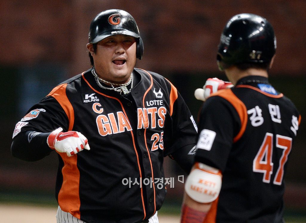 [인천=아시아경제 김현민 기자] 2015 KBO리그 롯데 자이언츠와 SK 와이번스의 경기가 26일 문학야구장에서 열렸다. 7회초 무사 1루에서 롯데 최준석이 SK 전유수를 상대로 추가 투런 홈런을 치고 대기타석의 강민호와 기뻐하고 있다. 김현민 기자 kimhyun81@asiae.co.kr<ⓒ세계를 보는 창 경제를 보는 눈, 아시아경제(www.asiae.co.kr) 무단전재 배포금지>