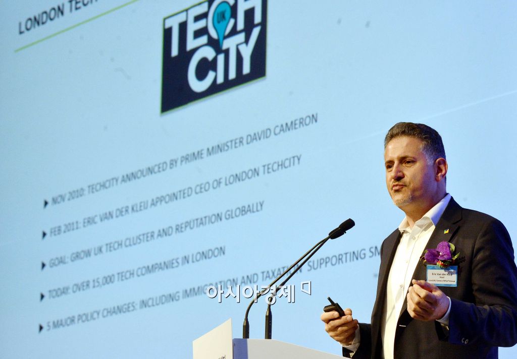 [아시아경제 최우창 기자] 27일 서울 종로구 그랑서울 컨벤션홀에서 '핀테크지원센터 데모 데이' 행사가 열린 가운데 Level39 대표를 맡고 있는 에릭 밴(Eric Van der Kleij) 축사를 하고 있다. 최우창 기자 smicer@asiae.co.kr<ⓒ세계를 보는 창 경제를 보는 눈, 아시아경제(www.asiae.co.kr) 무단전재 배포금지>