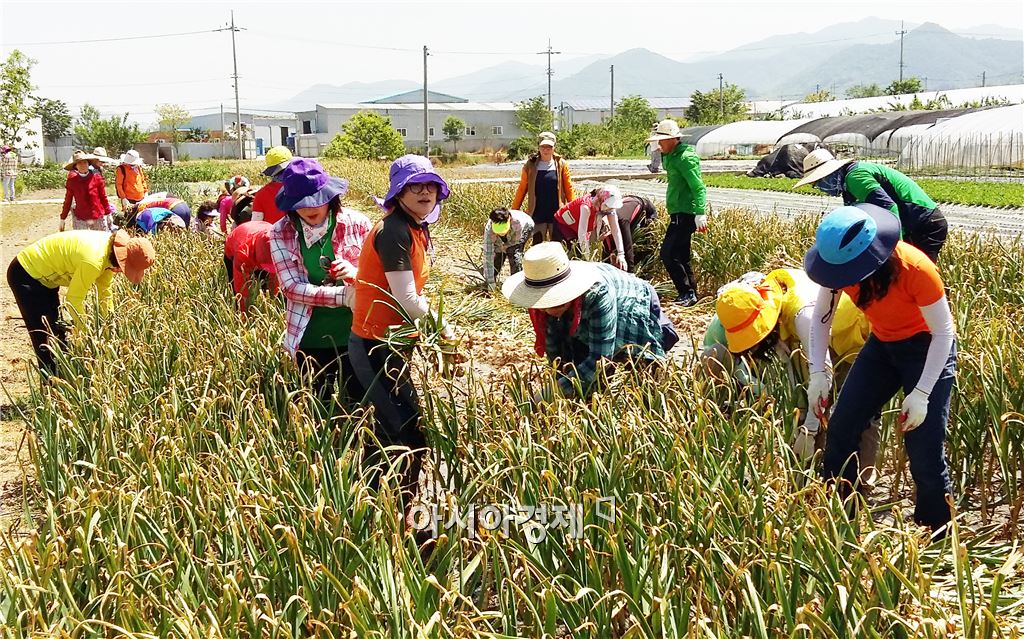전라남도주부명예기자와 도청 대변인실 직원 등 80여 명은 27일 장성군 황룡면 한 독거노인 농가의 마늘밭(700여 평)을 찾아가 마늘 캐기 작업 등 부족한 일손 돕기에 나섰다. 사진제공=전남도<br />