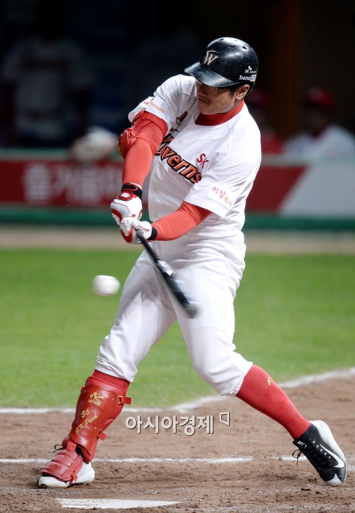 [인천=아시아경제 김현민 기자] 2015 KBO리그 롯데 자이언츠와 SK 와이번스의 경기가 27일 문학야구장에서 열렸다. 6회말 2사 1,2루에서 SK 박정권이 추가 2타점 2루타를 치고 있다. 김현민 기자 kimhyun81@asiae.co.kr<ⓒ세계를 보는 창 경제를 보는 눈, 아시아경제(www.asiae.co.kr) 무단전재 배포금지>