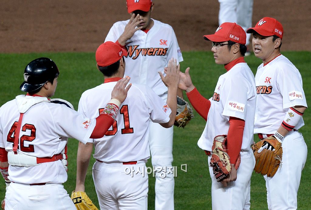 [인천=아시아경제 김현민 기자] 2015 KBO리그 롯데 자이언츠와 SK 와이번스의 경기가 27일 문학야구장에서 열렸다. SK 박정권이 6-0 승리를 확정지은 뒤 동료들과 기쁨을 나누고 있다. 김현민 기자 kimhyun81@asiae.co.kr<ⓒ세계를 보는 창 경제를 보는 눈, 아시아경제(www.asiae.co.kr) 무단전재 배포금지>