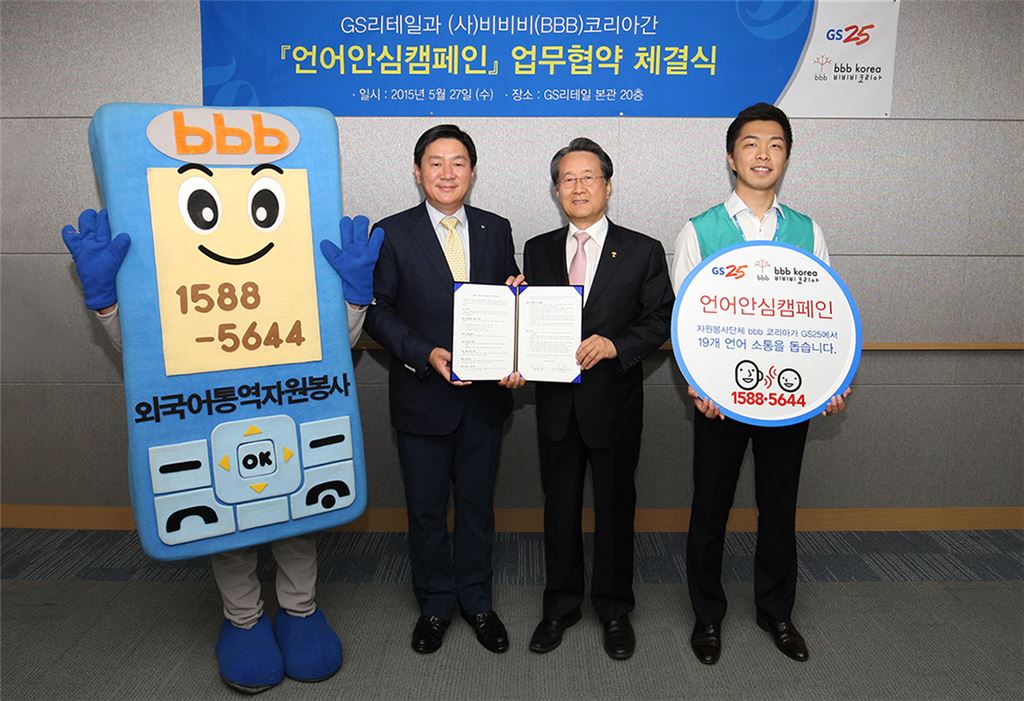대한민국 거주 외국인 및 관광객의 편리한 GS25 이용을 위한 업무협약 진행자원봉사 통역 서비스를 통해 GS25 경영주, 근무자, 관광객 모두 편의 높아져[아시아경제 이초희 기자]GS25 근무자와 GS25를 이용하는 외국인 고객 모두 대화가 안돼 답답했던 상황이 사라질 전망이다.GS리테일은 사단법인 비비비(BBB)코리아와 ‘편의점 방문 외국인 대상 의사소통불편 해소 및 양질의 서비스 제공’을 골자로 하는 ‘언어안심캠페인’ 업무협약(MOU)을 체결했다고 28일 밝혔다. GS리테일 20층 대회의실에서 진행된 이번 협약식에는 허연수 GS리테일 사장, 조윤성 GS리테일 부사장 등 GS리테일 관계자 5명과 bbb 코리아 유장희 회장 등 5명의 bbb 코리아 관계자가 참석한 가운데 진행됐다.bbb코리아는 세계 19개 언어, 4600여명의 통역 자원봉사자들이 전화를 통해 24시간 통역서비스를 제공하는 비영리 기관으로, GS25와 bbb 코리아의 이번 협약을 통해 대한민국을 방문한 외국인 관광객이나 대한민국 거주 외국인은 GS25에서 보다 정확한 소통이 가능하게 됐다.외국인과의 의사 소통이 필요한 GS25 경영주나 근무자는 1588-5644로 전화해 ARS 음성안내에 따라 통역이 필요한 언어를 선택함으로써 해당 언어 통역 봉사자와 연결할 수 있다. 통역봉사자는 외국인과 근무자와의 원활한 소통이 가능하도록 전화상으로 통역을 진행하는 시스템이다.GS25는 외국인의 방문이 많은 점포에 통역서비스 안내 표지판을 부착함으로써 외국인들에게 통역 서비스를 이용할 수 있음을 알리고, 의사 소통을 원하는 외국인들에게 적극적인 통역 서비스를 진행할 계획이다.이를 통해 외국인들은 단순히 GS25에서 상품을 구매하는 것에서 한 걸음 더 나아가 GS25를 통해 보다 다양한 정보와 서비스를 제공받을 수 있을 것으로 예상된다. GS25는 외국인이 의사 소통이 안돼 힘들어하는 상황이 해결될 수 있는 이번 협약이GS25의 긍정적인 이미지 구축뿐만 아니라 외국인 관광객에게 대한민국에 대한 좋은 인상을 심어 줄 수 있을 것으로 기대하고 있다.GS25는 bbb 코리아에 소속된 자원봉사자들을 격려할 수 있는 기프티쿠폰 제공과 캠페인 활동 참여 등을 통해 bbb 코리아를 지원할 계획이다.이강철 GS리테일 편의점 마케팅팀장은 “이번 협약은 통역 자원봉사 단체인 bbb 코리아와 함께 외국인을 위한 서비스를 획기적으로 개선할 수 있는 밑거름이 될 것으로 기대하고 있다”며 “앞으로도 국내 고객뿐만 아니라 외국인 고객의 만족감을 높일 수 있도록 최선을 다하겠다”고 말했다. 한편, 사단법인 bbb 코리아는 문화체육관광부 등록 비영리 기관으로 외국어 재능을 활용해 재능나눔 활동을 전개하는 언어?문화 봉사단체다. 이초희 기자 cho77love@asiae.co.kr<ⓒ세계를 보는 창 경제를 보는 눈, 아시아경제(www.asiae.co.kr) 무단전재 배포금지>