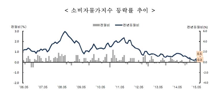 [아시아경제 조슬기나 기자]소비자물가가 6개월 연속 0%대를 기록했다. 올 초 담뱃값 인상효과를 제외하면 넉달째 마이너스 물가다. 통계청이 2일 발표한 5월 소비자물가 동향에 따르면 지난달 소비자물가지수는 전년 동월 대비 0.5% 올랐다. 지난해 12월부터 6개월 연속 0%대다. 소비자물가는 2012년 6월 이후 한국은행의 물가안정 목표치(2.5~3.5%)를 줄곧 밑돌고 있다. 지난 1월 정부가 담뱃값을 2000원 올리면서 인위적으로 상승한 부분(0.58% 포인트)을 배제하면 사실상 마이너스 행진이다. 농산물과 석유류를 제외한 근원물가의 상승률은 작년보다 2.1% 올랐다. 5개월 연속 2%대다. 구입 빈도가 높고 지출비중이 높아 소비자들이 가격변동에 민감하게 반응하는 142개 품목으로 작성된 생활물가지수는 전년 동월 대비 0.4% 하락했다. 식품이 전월 대비 1.2%, 전년 동월 대비 2.9% 각각 상승했다. 식품 이외에는 하락했다. 전월세를 포함한 생활물가지수는 전월 대비 0.3% 올랐다. 전년 동월 대비로는 동일한 수준이다.신선식품지수는 전월대비 2.7%, 전년동월대비 3.2% 각각 상승했다.정부는 하반기로 갈수록 소비자물가가 상승할 것으로 내다보고 있다. 국제유가가 완만하게 상승하는 가운데 기저효과가 소멸하고, 실물경제가 개선될 것이란 관측이다. 디플레이션 우려 역시 근원물가가 2%대를 유지하고 있어 큰 문제가 없다는 입장이다.세종=조슬기나 기자 seul@asiae.co.kr<ⓒ세계를 보는 창 경제를 보는 눈, 아시아경제(www.asiae.co.kr) 무단전재 배포금지>