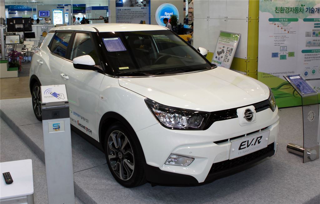 ENVEX 2015 쌍용차 부스에 전시된 티볼리 EVR. 주행거리 확장기술을 활용해 최대 400km(최고속력 150km/h)까지 주행할 수 있으며 EV 모드 시 최대 125km까지 순수 전기에너지만으로 주행 가능하다.