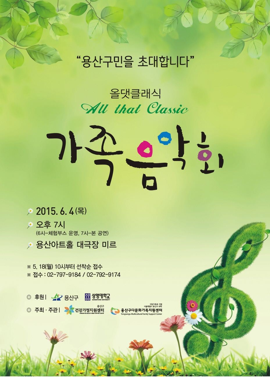 [아시아경제 박종일 기자] 용산구(구청장 성장현)가 4일 가족은 물론 이웃들과 함께 즐기는 가족음악회 ‘All That Classic’ 을 개최한다. 지역사회의 다양한 가족과 이웃이 함께하는 여가문화프로그램을 통해 가족 및 이웃 간 결속감과 유대감을 강화시키고 소통 기회를 제공함으로써 가족 친화적인 분위기를 확산시키고 지역공동체 형성 및 지역통합에 기여하고자 이번 음악회를 마련했다. 현악 앙상블, 관현악, 합창 등 다양한 형태의 클래식을 감상할 수 있으며 미아방지 팔찌 만들기, 건강가정지원사업, 아이돌봄지원사업 등과 관련한 체험부스도 준비했다.
