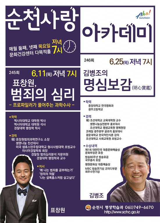 " 순천시 문화건강센터 다목적홀 저녁 7시 "[아시아경제 노해섭 ]순천시는 6월 순천사랑아카데미를 표창원 소장과 김병조 교수를 초청해 강연을 진행한다. 매월 둘째 넷째 목요일, 순천시문화건강센터 다목적홀에서 진행되는 순천사랑아카데미는 그동안 참여가 어려웠던 직장인을 비롯한 많은 시민의 참여를 위해 저녁 7시로 시간을 옮겨 운영하게 된다. 6월11일은 표창원(범죄과학연구소)소장의 강연으로 시민과 함께 할 예정이다. “범죄의 심리-프로파일러가 풀어주는 과학수사”라는 주제의 표창원 소장은, 범죄가 특정인에게 해당되는 것이 아니라 치열한 경쟁사회와 복잡한 인간관계, 성과 중심의 사회 등 사회환경적 요인에 의해 범죄가 발생한다는 내용으로 강의를 진행한다.또한 6월 25일은 김병조 교수(조선대학교 교수, 개그맨)의 강연이 열린다.“김병조의 명심보감-명심보감에서 배우는 행복”이라는 주제로 명심보감의 주요내용을 다룰 예정이다. 또한 어렵게 느껴졌던 명심보감의 명언들과 한문을 쉽게 풀어 시민들과 함께 즐거운 명심보감으로의 시간여행이 될 것으로 기대된다. 시 관계자는 “배움의 기회를 제공하고 건전한 여가활용과 취미생활을 통해 자아실현의 기회를 마련했다"며 "계층별 다양한 종류의 강의로 지역주민의 교육 욕구를 충족시키고 바른 품성 함양을 지원하기 위해 최선을 다하겠다”고 말했다. 기타 순천사랑 아카데미에 대한 자세한 내용은 순천시문화건강센터 홈페이지(//www.schc.go.kr/ ) 또는 평생학습과 749-6670~3으로 문의하면 된다.노해섭 기자 nogary@<ⓒ세계를 보는 창 경제를 보는 눈, 아시아경제(www.asiae.co.kr) 무단전재 배포금지>