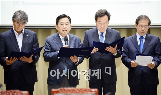 조충훈 순천시장(왼쪽에서 두번째)은 4일 서울시청에서 열린 서울시와 상생협력사업을 추진중인 지자체를 중심으로 한 ‘지역상생포럼’창립총회에 참석했다.<br />