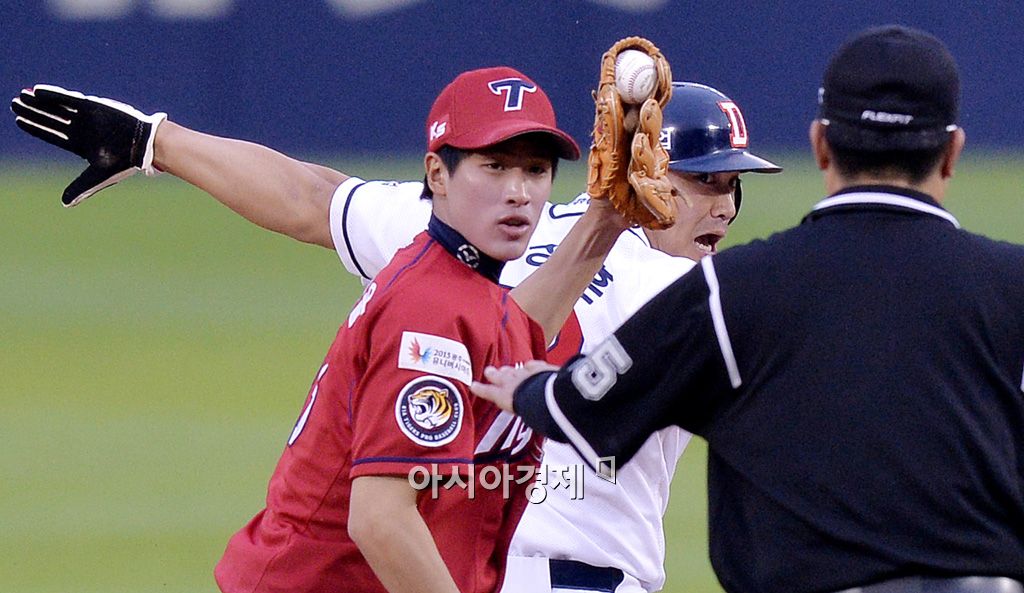 [잠실=아시아경제 김현민 기자] 2015 KBO리그 KIA 타이거즈와 두산 베어스의 경기가 4일 잠실야구장에서 열렸다. 2회말 2사 1루에서 두산 박건우 타석 때 1루주자 홍성흔이 2루 도루를 시도한 뒤 2루심의 판정을 바라보고 있다. 김현민 기자 kimhyun81@asiae.co.kr<ⓒ세계를 보는 창 경제를 보는 눈, 아시아경제(www.asiae.co.kr) 무단전재 배포금지>
