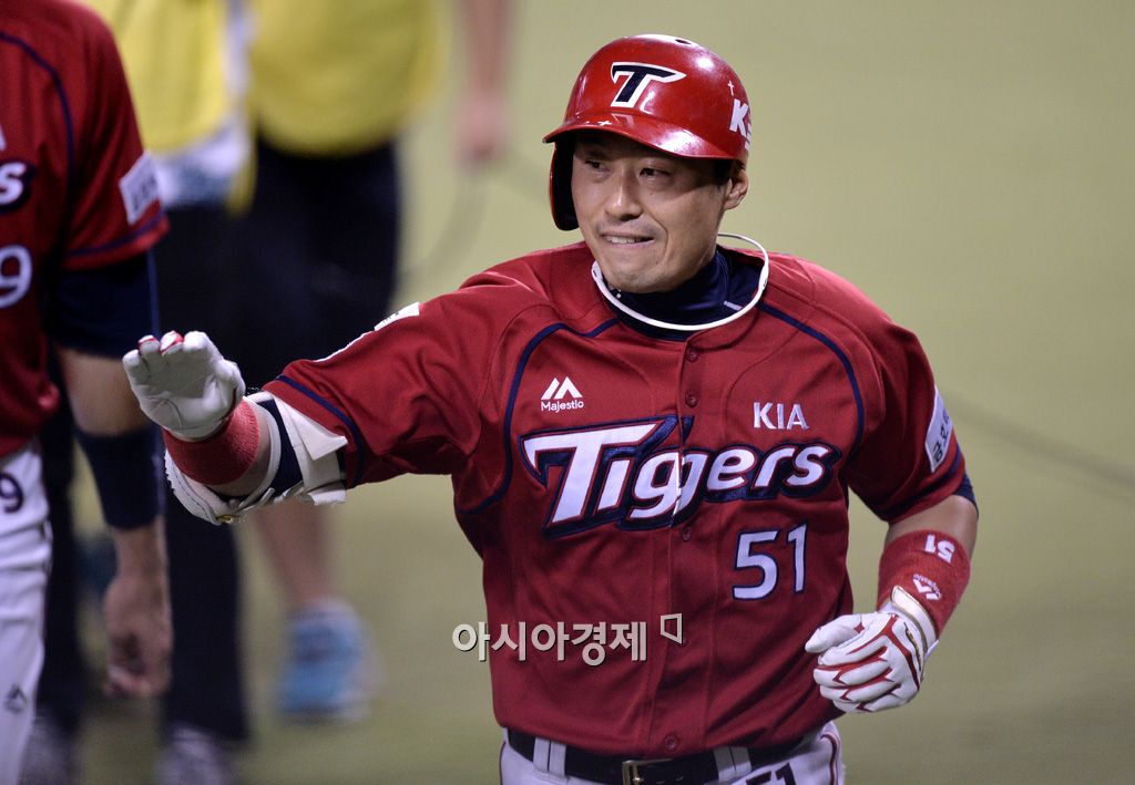 [잠실=아시아경제 김현민 기자] 2015 KBO리그 KIA 타이거즈와 두산 베어스의 경기가 4일 잠실야구장에서 열렸다. 8회초 2사 1,3루에서 KIA 김원섭이 두산 윤명준을 상대로 추가 3점 홈런을 치고 대기타석의 박기남과 하이파이브하고 있다. 김현민 기자 kimhyun81@asiae.co.kr<ⓒ세계를 보는 창 경제를 보는 눈, 아시아경제(www.asiae.co.kr) 무단전재 배포금지>