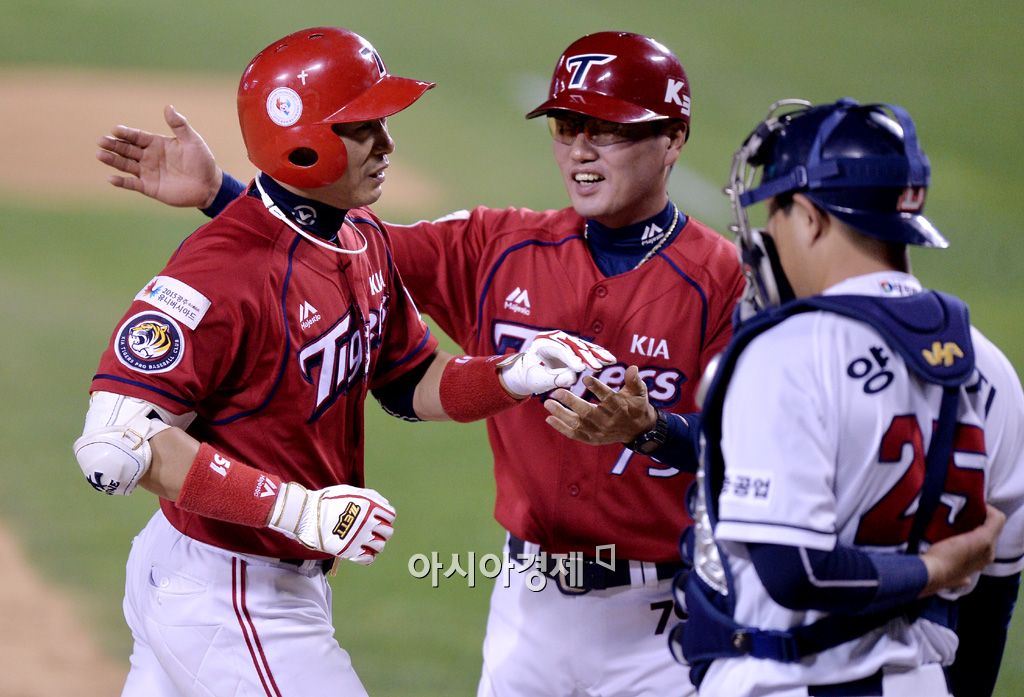 [잠실=아시아경제 김현민 기자] 2015 KBO리그 KIA 타이거즈와 두산 베어스의 경기가 4일 잠실야구장에서 열렸다. 8회초 2사 1,3루에서 KIA 김원섭이 두산 윤명준을 상대로 추가 3점 홈런을 치고 김태룡 코치와 기쁨을 나누고 있다. 김현민 기자 kimhyun81@asiae.co.kr<ⓒ세계를 보는 창 경제를 보는 눈, 아시아경제(www.asiae.co.kr) 무단전재 배포금지>