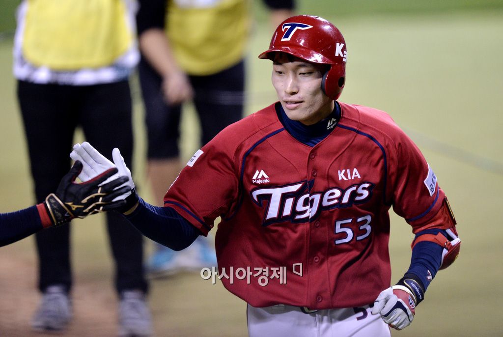 [잠실=아시아경제 김현민 기자] 2015 KBO리그 KIA 타이거즈와 두산 베어스의 경기가 4일 잠실야구장에서 열렸다. 9회초 1사에서 KIA 김호령이 두산 이현호를 상대로 추가 솔로 홈런을 치고 대기타석의 최용규와 하이파이브하고 있다. 김현민 기자 kimhyun81@asiae.co.kr<ⓒ세계를 보는 창 경제를 보는 눈, 아시아경제(www.asiae.co.kr) 무단전재 배포금지>