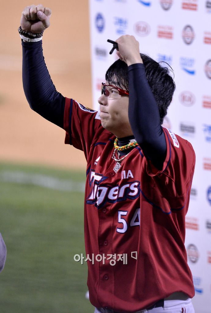 [잠실=아시아경제 김현민 기자] 2015 KBO리그 KIA 타이거즈와 두산 베어스의 경기가 4일 잠실야구장에서 열렸다. KIA 선발투수 양현종이 6-0 완봉승을 확정지은 뒤 팬들의 환호에 두 주먹을 불끈 쥐며 답례하고 있다. 김현민 기자 kimhyun81@asiae.co.kr<ⓒ세계를 보는 창 경제를 보는 눈, 아시아경제(www.asiae.co.kr) 무단전재 배포금지>