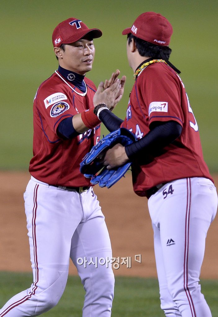 [잠실=아시아경제 김현민 기자] 2015 KBO리그 KIA 타이거즈와 두산 베어스의 경기가 4일 잠실야구장에서 열렸다. KIA 선발투수 양현종이 6-0 완봉승을 확정지은 뒤 김원섭과 하이파이브하고 있다. 김현민 기자 kimhyun81@asiae.co.kr<ⓒ세계를 보는 창 경제를 보는 눈, 아시아경제(www.asiae.co.kr) 무단전재 배포금지>