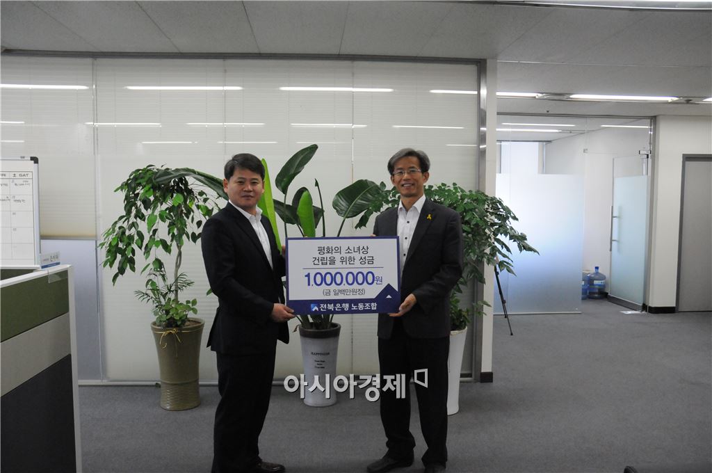 [아시아경제 조은임 기자]전북은행 노동조합은 창립 42주년 기념행사를 생략하는 대신 '평화의 소녀상' 건립 성금 100만원과 전북은행 동우회에 발전기금 200만원을 전달했다고 5일 밝혔다.전북은행 노조는 "1973년 6월 5일 노동조합을 설립한 이래, 지난해까지 매년 회사의 구성원이 참석한 기념식을 개최해 왔으나, 형식적인 성향이 강하다는 판단 하에 올해는 행사를 열지 않기로 했다"며 "절감된 비용은 일본군 위안부 문제 진실을 밝히기 위한 '평화의 소녀상' 건립과 전북은행 선배들을 위해 '전북은행 동우회 발전기금'으로 전달했다"고 말했다.이날 전달된 '평화의 소녀상 건립 성금'은 전주 풍남문 광장에 건립될 '평화의 소녀상' 재원으로 쓰일 예정이다. 조은임 기자 goodnim@asiae.co.kr<ⓒ세계를 보는 창 경제를 보는 눈, 아시아경제(www.asiae.co.kr) 무단전재 배포금지>