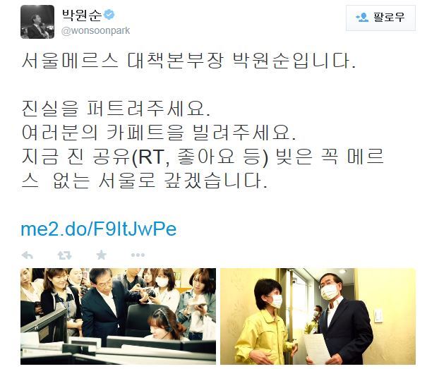 [아시아경제 온라인이슈팀] 박원순 서울시장이 서울 메르스 관리 계획을 공개했다. 5일 박원순 서울시장이 JTBC '뉴스룸'에 출연해 "어제 브리핑은 정부 당국과의 협의를 거쳐 진행한 것"이라는 사실을 공개했다. 이어 박원순 서울시장은 SNS를 통해 "서울 메르스 대책본부장 박원순입니다"라고 시민들에게 저녁보고를 알린 후 "진실을 퍼트려주세요. 여러분의 카페트을 빌려주세요. 지금 진 공유(RT, 좋아요 등) 빚은 꼭 메르스 없는 서울로 갚겠습니다"라는 링크를 게재했다.특히 박원순 서울시장은 "사실을 감췄을 때와 진실을 전달했을 때 어느 쪽이 더 불안을 조작하는 것입니까? 사실을 감춰서 불안하지 않았습니까? 다른 결과를 원한다는 다른 방법을 찾아야 합니다"라고 주장했다.또한 박원순 서울시장은 "메르스는 완치되는 병"이라며 빅데이터 분석도 이용하고 있음을 밝혔으며 "35번 환자의 이야기도 귀를 기울이겠다. 어찌 보면 그도 정부조기대응 실패의 피해자다"라고 언급했다.이어 박원순 서울시장은 "서울은 국가지정 전염병 관리의 컨트롤 타워인 정부에 협조하고 협력할 준비가 언제든 되어 있다"라며 "언제 어디서든 불러주시면 보건당국책임자와 만나 서울의 위중한 상황을 설명 드리고 함께 협력해가는 방안을 찾아가고자 한다"라고 보고를 마쳤다.한편, 보건복지부는 6일 "메르스 첫 감염자의 아내인 2번 환자(63·여)가 2차례에 걸친 메르스 바이러스 검사에서 모두 음성 판정을 받고 5일 퇴원했다"고 밝혔다.온라인이슈팀 issue@asiae.co.kr<ⓒ세계를 보는 창 경제를 보는 눈, 아시아경제(www.asiae.co.kr) 무단전재 배포금지>