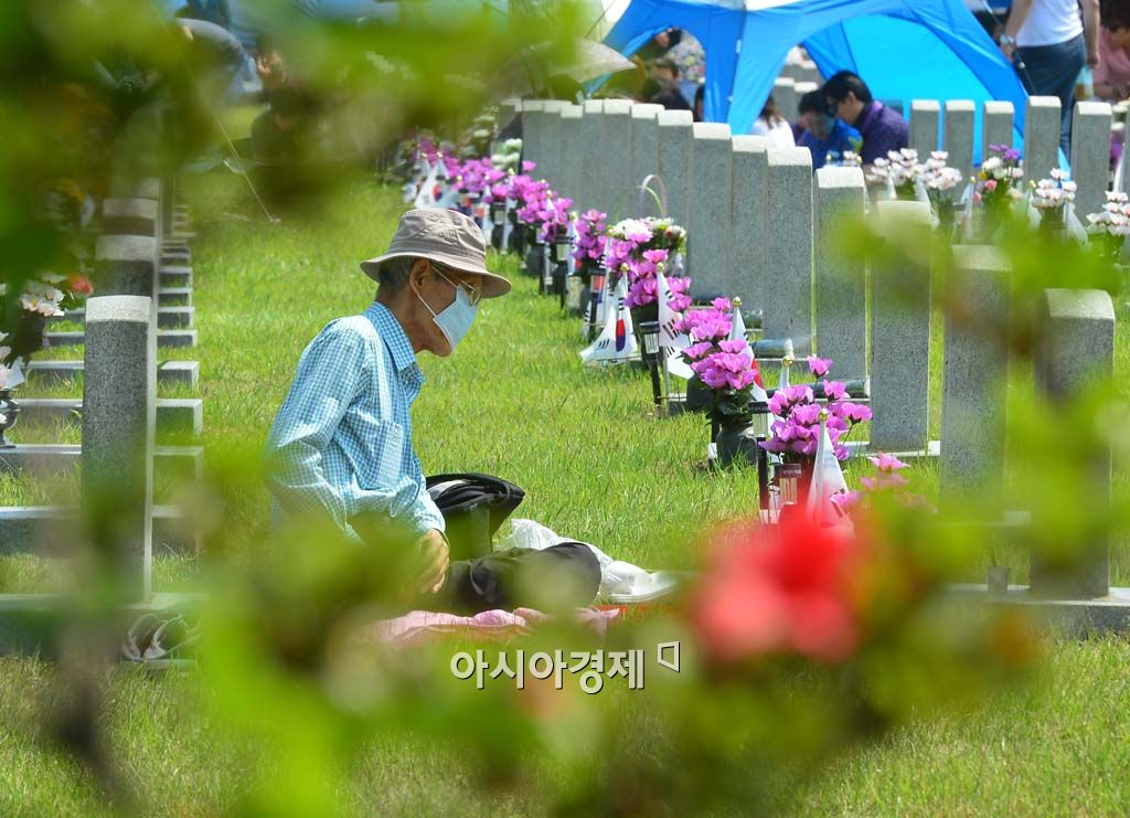 [아시아경제 백소아 기자] 현충일을 맞은 6일 서울 동작구 국립서울현충원에서 한 추모객이 마스크를 쓴 채 생각에 잠겨있다.백소아 기자 sharp2046@asiae.co.kr<ⓒ세계를 보는 창 경제를 보는 눈, 아시아경제(www.asiae.co.kr) 무단전재 배포금지>