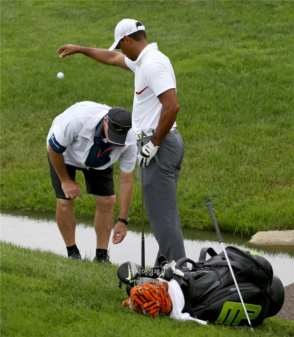 타이거 우즈가 메모리얼토너먼트 셋째날 17번홀 워터해저드 옆에서 드롭을 하고 있다. 더블린(美 오하이오주)=Getty images/멀티비츠