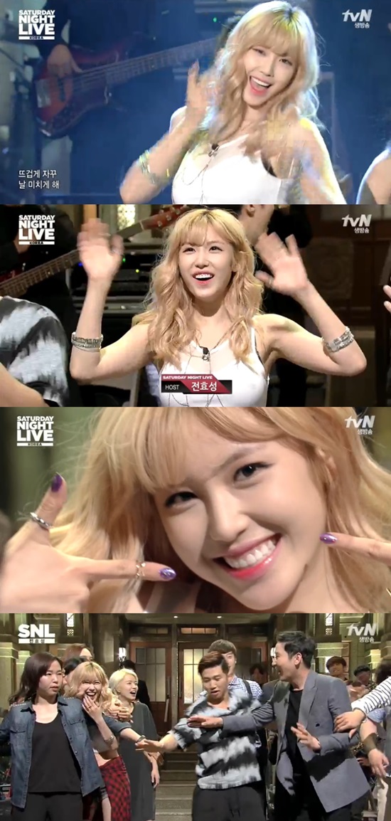 [아시아경제 온라인이슈팀] 전효성이 자신의 매력적인 부위에 대해 언급했다. 6일 방송된 tvN 'SNL코리아'에서는 남심을 흔드는 베이글녀 전효성이 메인 호스트로 출연했다.이날 전효성은 본격적인 방송 시작에 앞서 자신의 노래 '바디파티'와 '반해'로 요염한 섹시 댄스를 선보였다. 신동엽은 "저번에 시크릿 편에 멤버들과 함께 출연했는데 이번에는 혼자 나왔다"고 말문을 열었다. 이에 전효성은 "저번에 나왔을 때 뜨거운 사랑을 받은 걸로 기억한다. 단독 호스트로 출연해서 영광이다"고 소감을 밝혔다. 이어 신동엽은 "본인이 생각했을 때 매력적인 부위가 어디인가?"라고 질문했고 전효성은 "저의 매력적인 그 부위는 선천적으로 타고나서 크고 예쁘다. 제대로 보여드리면서 매력 발산 해드릴까요?"라고 말해 큰 환호를 받았다.하지만 전효성이 보인 그 매력적인 부위는 잇몸. 여자 패널들은 "예쁘다"며 좋아했지만 신동엽은 "지금 장난치냐"고 말해 웃음을 자아냈다. 한편 'SNL코리아'는 매주 토요일 밤 9시 45분 방송된다.온라인이슈팀 issue@asiae.co.kr<ⓒ세계를 보는 창 경제를 보는 눈, 아시아경제(www.asiae.co.kr) 무단전재 배포금지>