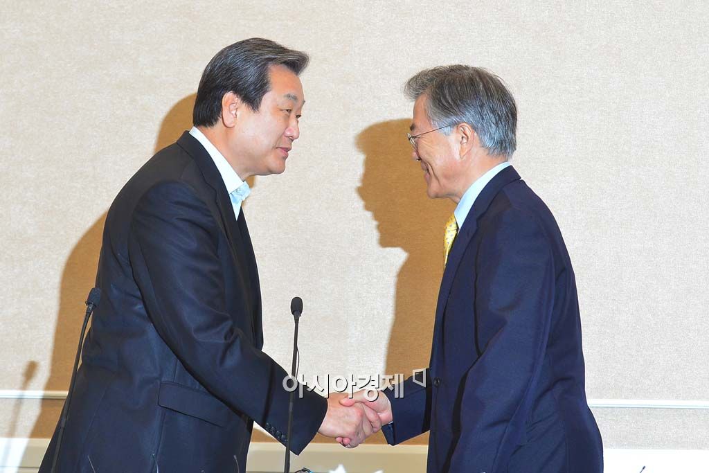[아시아경제 백소아 기자] 7일 서울 여의도 국회의사당에서 열린 메르스 대책마련을 위한 여야 4+4회담에서 김무성 새누리당 대표(왼쪽)와 문재인 새정치민주연합 대표가 악수를 하고 있다.백소아 기자 sharp2046@asiae.co.kr<ⓒ세계를 보는 창 경제를 보는 눈, 아시아경제(www.asiae.co.kr) 무단전재 배포금지>