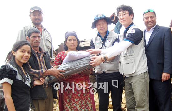 호남대학교 이효철 교수(응급구조학과장. 오른쪽에서 두번째)가 대규모 지진피해로 고통 받고 있는 네팔 재난지역에서 구호작업을 펼쳤다.<br />
