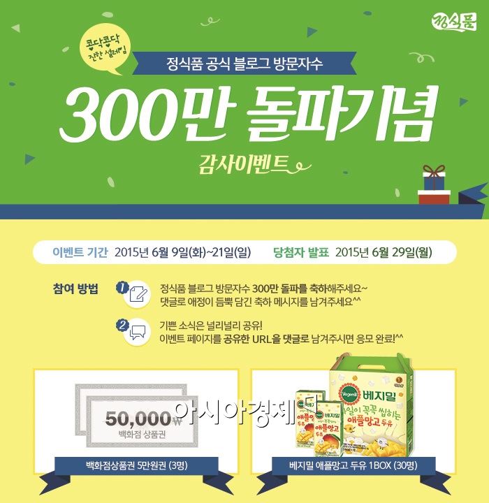 [아시아경제 이광호 기자]정식품은 공식 블로그인 '콩닥콩닥 진한 설레임(blog.naver.com/vegemilstory)'의 누적 방문자수가 300만명을 돌파, 감사 이벤트를 진행한다고 9일 밝혔다.이벤트 참여는 정식품 공식 블로그에 방문해 해당 이벤트 게시글에 축하 메시지를 덧글로 등록하면 된다. 추첨을 통해 백화점상품권(5만원권), '베지밀 과일이 꼭꼭 씹히는 애플망고 두유'를 선물로 증정한다. 당첨자는 이달 29일에 발표한다.한편 정식품은 2012년부터 공식 블로그 뿐만 아니라 페이스북(facebook.com/vegemilgood)과 트위터(twitter.com/vegemilgood)를 운영하고 있으며 2015년에는 공식 카카오스토리를 새로 오픈하면서 고객 소통을 위한 소셜네트워크서비스(SNS) 마케팅에 힘쓰고 있다. 실제로 SNS상에서 수렴한 고객의 의견을 반영한 패키지 디자인 적용 및 신제품 출시를 하는 등 SNS를 통해 고객의 의견을 듣고 직접적인 소통을 위한 창구로서 적극 활용하고 있다.이광호 기자 kwang@asiae.co.kr<ⓒ세계를 보는 창 경제를 보는 눈, 아시아경제(www.asiae.co.kr) 무단전재 배포금지>