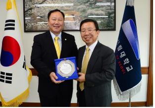 김인호 서울시의회 부의장(왼쪽)이 원윤희 서울시립대학교 총장으로부터 감사패를 받았다.