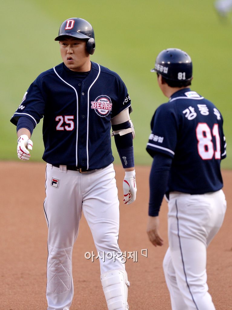 [잠실=아시아경제 김현민 기자] 2015 KBO리그 두산 베어스와 LG 트윈스의 경기가 9일 잠실야구장에서 열렸다. 1회초 2사 만루에서 두산 양의지가 선취 2타점 적시타를 치고 출루하고 있다. 김현민 기자 kimhyun81@asiae.co.kr<ⓒ세계를 보는 창 경제를 보는 눈, 아시아경제(www.asiae.co.kr) 무단전재 배포금지>